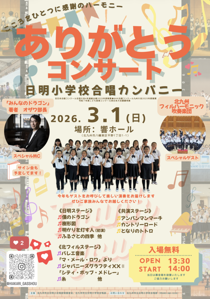 そのモデルである 北九州市立日明小学校合唱カンパニー (顧問・竹永亮太先生)が3月1日、響ホール(福岡県北九州市)で「ありがとうコンサート」を開催します【入場無料】。